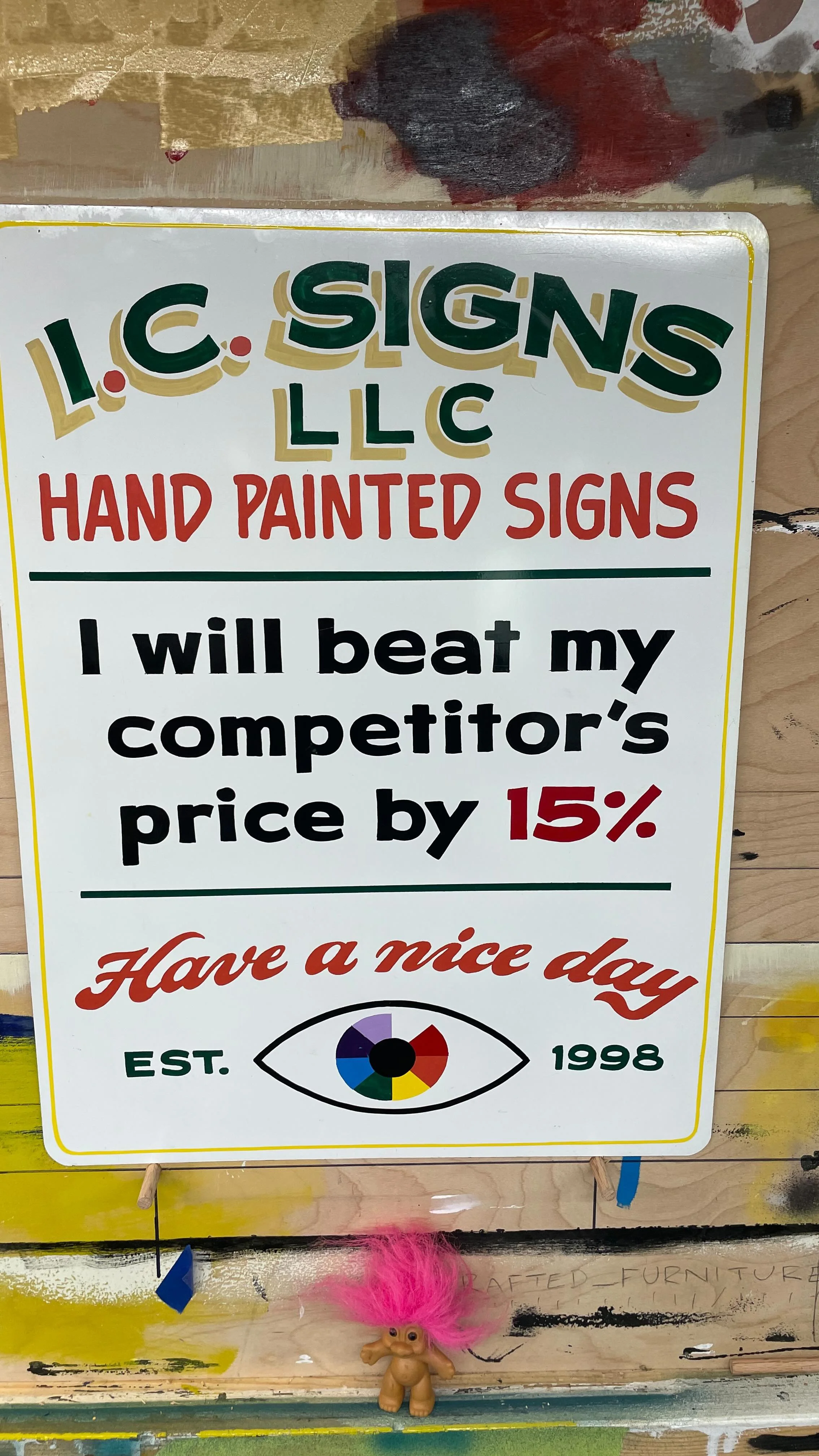 I am the son of an art teacher. Paint has been my medium since I was a child and in many ways, making art for the public has been part of my arena since I was young. I was drawn to sign painting when I was a teenager, landing my first contract when I 19 years old. The sign came out OK. I persisted for a few years, learning along the way until I was taken under the wing of a real sign painter with formal training. It was with him that I learned the secrets of viscosity, opacity, brush control, balance, and design among other things we sign painters hold sacred.