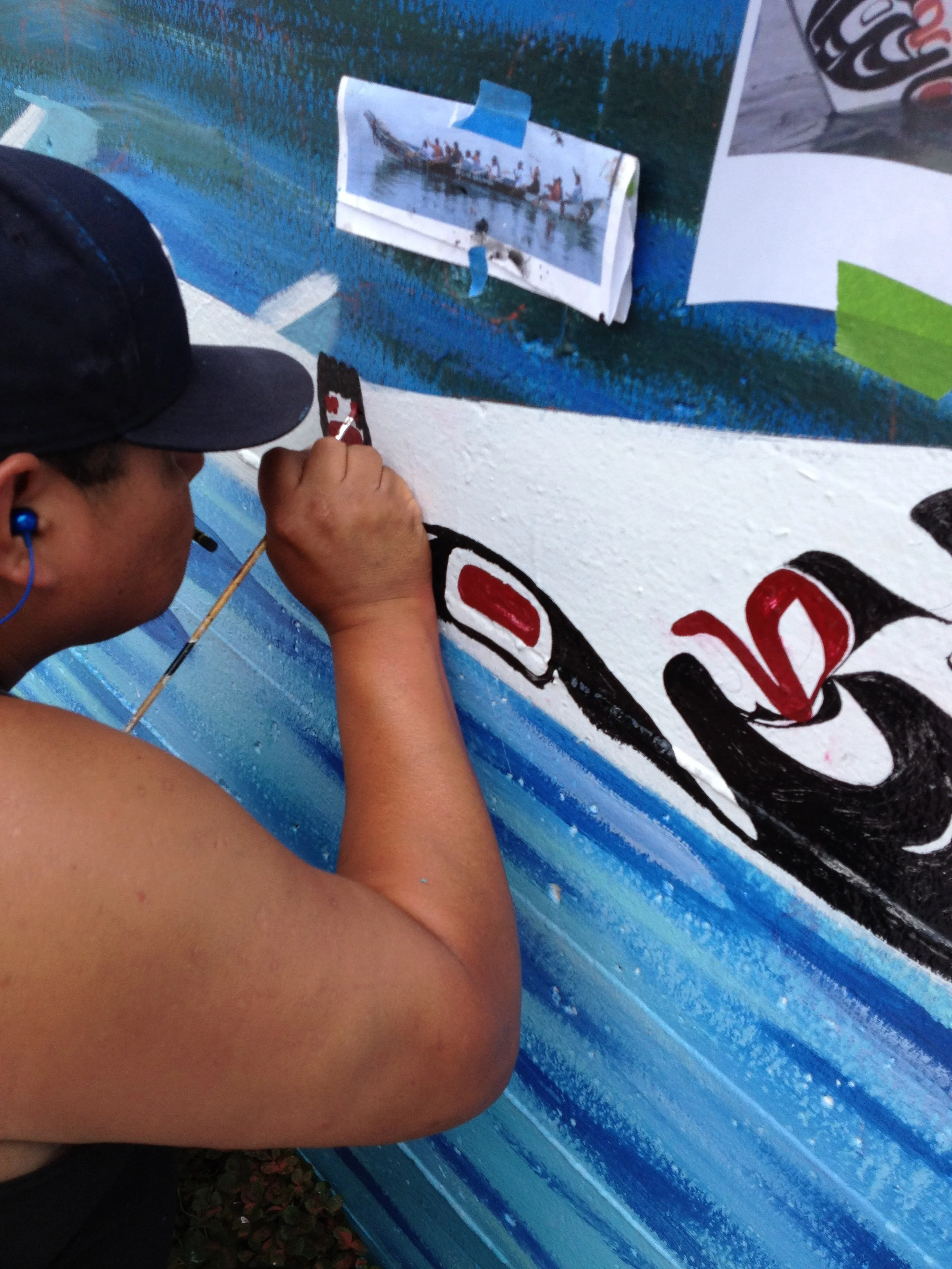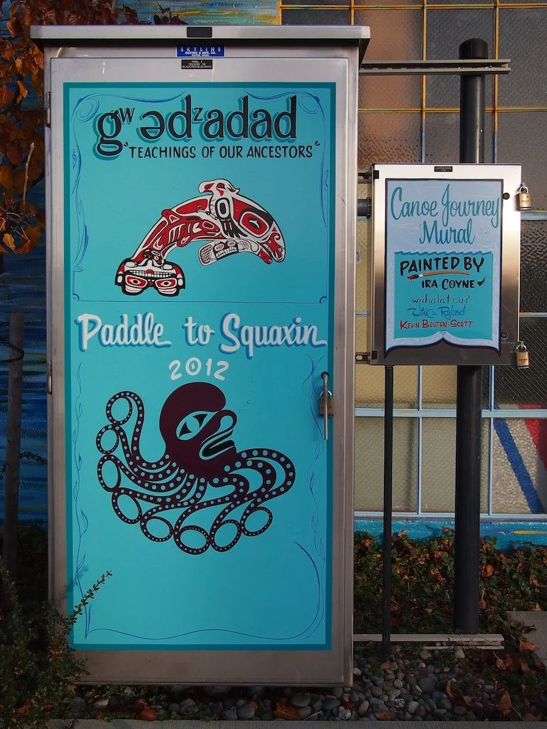 In 2012, The Olympia Downtown Association provided a grant for this mural on Percival Landing. Joe and I were the leading applicants. He had the artistic training and cultural background in Coast Salish art, but no mural painting experience. I had the mural and logistical training of working in the public, but no experience with Coastal Salish art. Our friendship began here and endures today. This mural was a welcoming mural for the 2012 Paddle to Squaxin Tribal Journey. During the summer of 2012, Indigenous tribes from as far as Alaska, New Zealand, and The Great Lakes gathered on the West coasts of Canada and The United States and paddled their way to downtown Olympia in dugout canoes for a week of protocol, sharing, and potlatch at the Squaxin Island Indian Tribe reservation. Our mural depicts actual canoe families referenced from photos of previous journeys Joe had been on, his Rising Sun design, the Cascade mountain range, and a collaboratively designed Welcome Figure; a traditional carving that would stand on the shores of an ancestral territory, welcoming visitors that came by water.